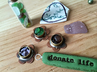 The 3 sweet flower bezels are from Tracy Bell of Copper, Glass and Recycled Trash. Tracy makes the best stuff! I've had these bezels for the longest time, waiting for just the right project. I filled them with green and brown sea glass tinies and I crushed a piece of mussel shell for the third. I love the colors. However, when the resin was added a bit of the detail was lost and it makes the green and brown glass look like a solid transparent lump and the mussel shells darken (which I knew they would, but I didn't think they would so much - I took this pic in sunlight so you could see the colors). Bummer...