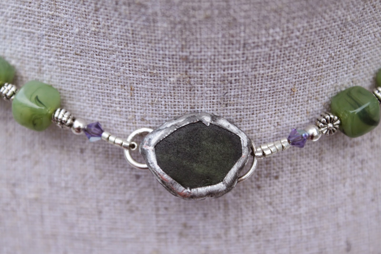 The clasp is also a piece of sea glass, green, that I foiled, soldered and added a hook to the back. I rubbed a tiny bit of coconut oil onto both the green and brown pieces of sea glass. It gives it a nice glow and brings the color out (it does not go rancid, so it's a good choice). The little silver toned spacers are from Michael's. I think they're little daisies, but I'm preferring to think of them as sunflowers, which is a symbol for us of T.J. As I was pulling items out (you should see my studio presently), I pulled out a couple of vials of sterling silver coated and copper seed beads that I've had forever. Oh my gosh, I can't believe what I paid for these years ago (I'm sure they'd be a lot more today)! Thankfully I had the discount at The Beadin' Path!
