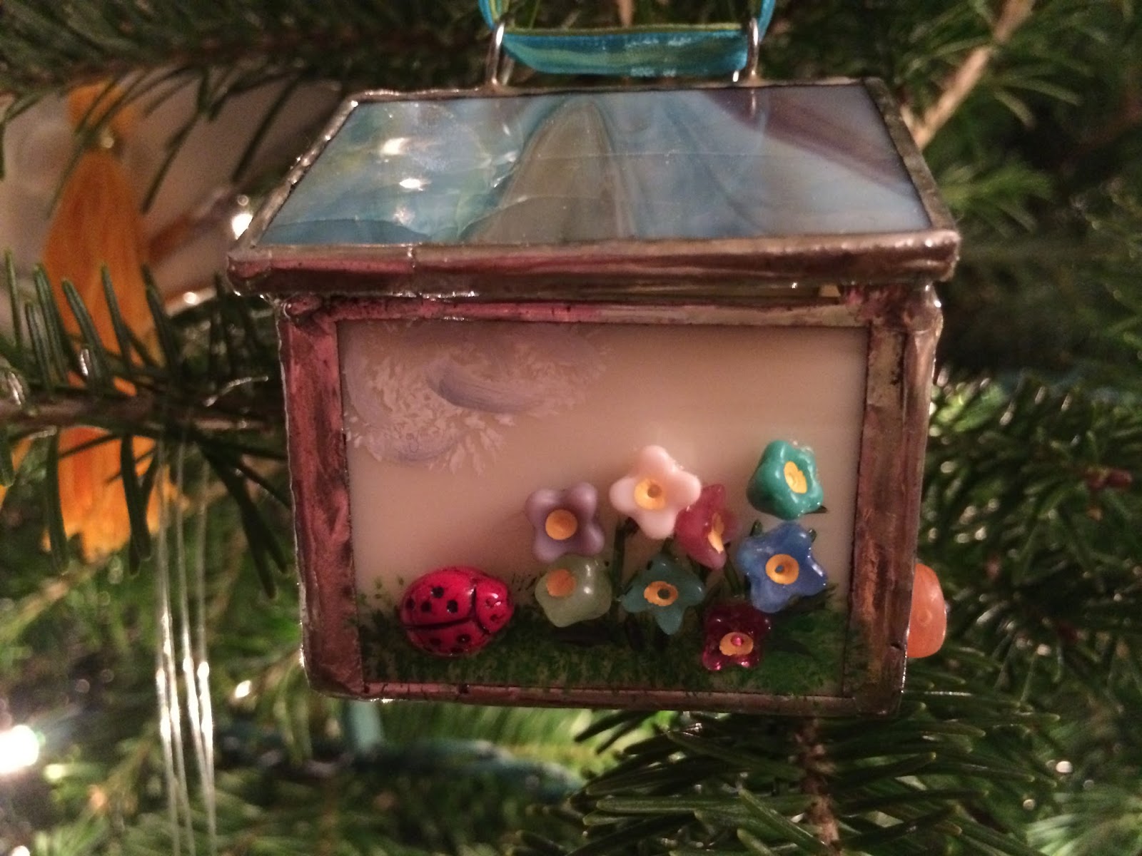 The main medium I work with is stained glass and paint. This sweet little birdhouse is a tiny bit wonky (you'll see when I show you the back). It's the first 3-D ornament, or any stained glass item, I've made. I've embellished her not only with paint, but with contemporary and vintage glass flower beads and a sweet vintage Swarovski connector as an entrance hole. That an entrance with style!