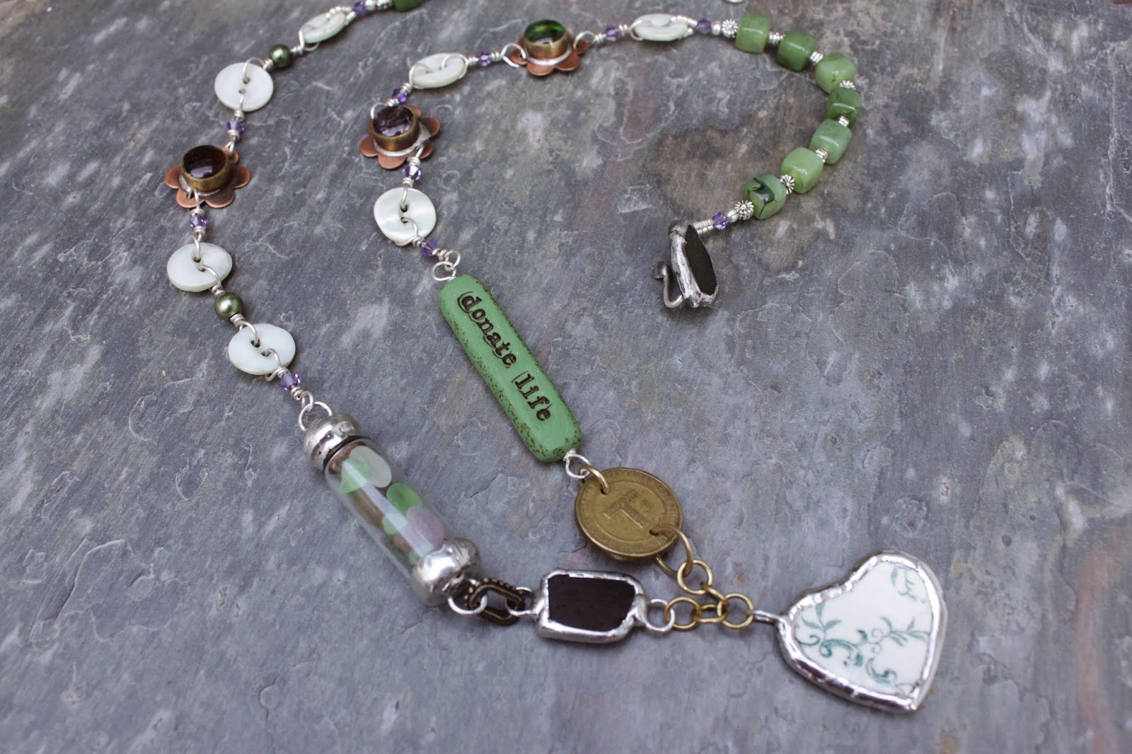 The heart pendant started out as a pottery shard that I picked up on one of my many beach walks. The heart is a reminder of T.J.'s huge, beautiful, loving heart and the life that he was able to give another.